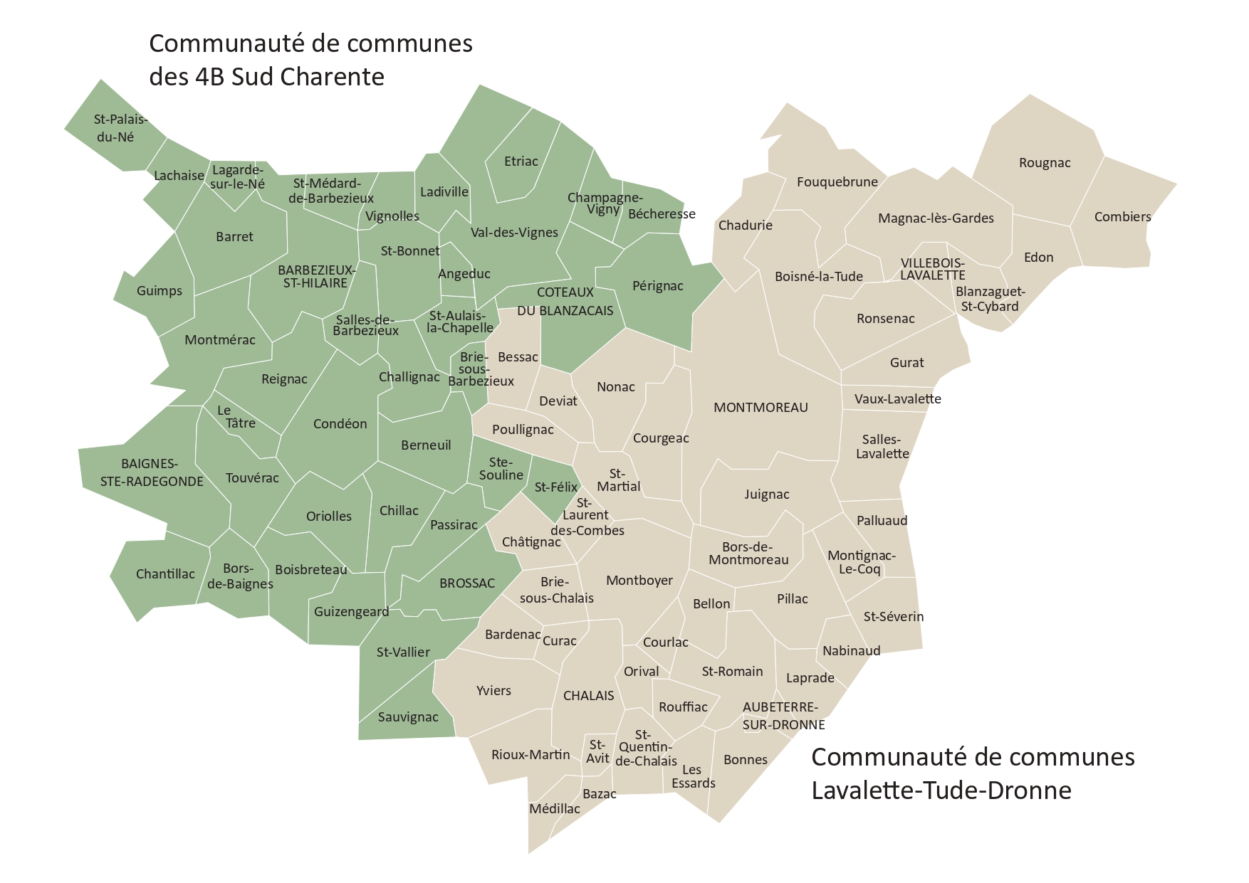 Au fil des années son périmètre a évolué pour aboutir à sa composition actuelle de 2 communautés de communes : 4B Sud Charente et Lavalette Tude Dronne